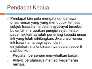Mahasiswa tahun pertama merupakan frasa yang menduduki fungsi sebagai subjek. Sebagai contohnya subjek predikat frasa nama frasa. Arbak Othman 1985166 Dengan demikian ayat dasar ialah ayat yang tidak mengandungi unsur pada frasa subjek atau frasa predikat Nik Safiah et al.