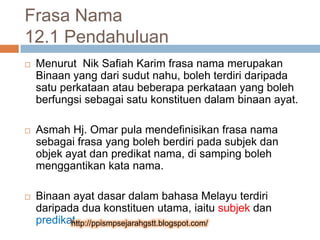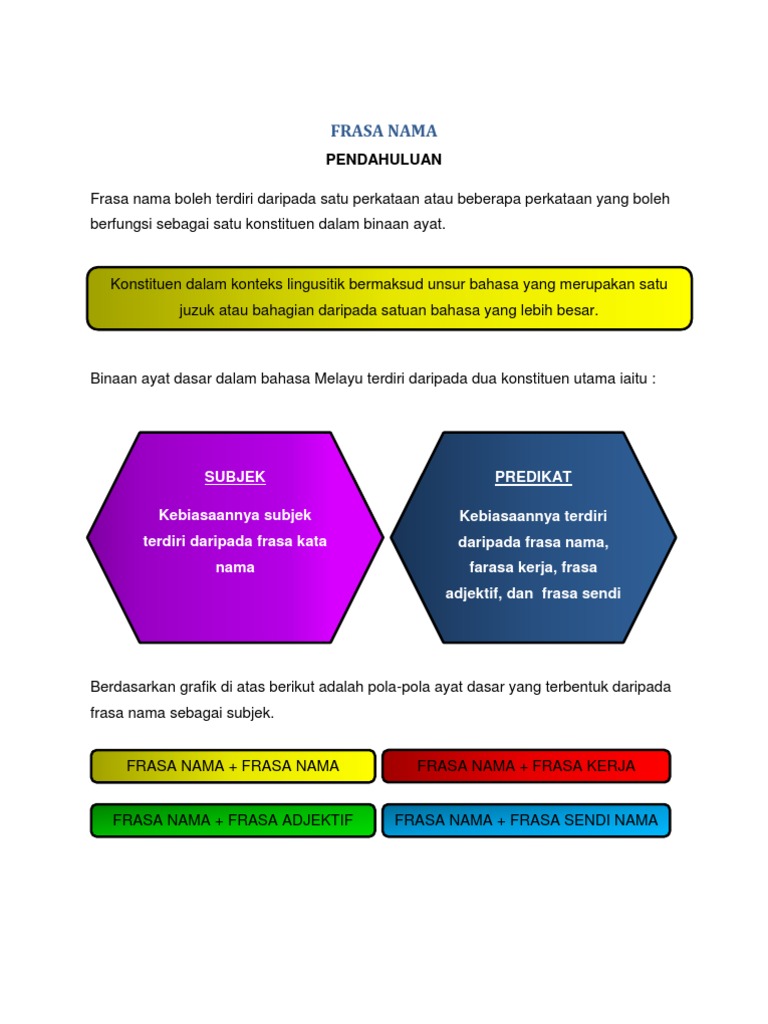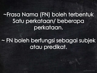 Dalam tatabahasa frasa ialah binaan yang boleh terdiri daripada satu patah kata atau rentetan beberapa patah kata yang berfungsi sebagai konstituen dalam ayat sama ada sebagai subjek predikat objek atau keteranganFrasa tiada subjek dan predikat. 1 FN FN 2 FN FK 3 FN FA 4 FN FS - Frasa nama berfungsi sebagai subjek frasa nama hanya berfungsi sebagai predikat dalam pola FN FN. Kata Nama Am Kata Nama Khas Kata Nama Terbitan Kata Ganti Diri.